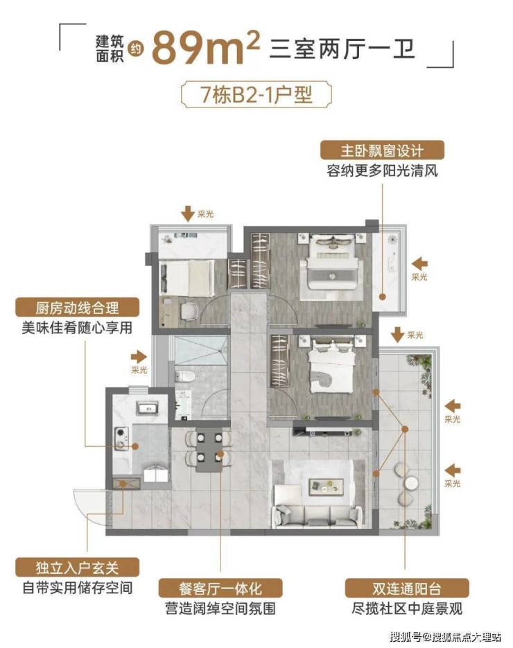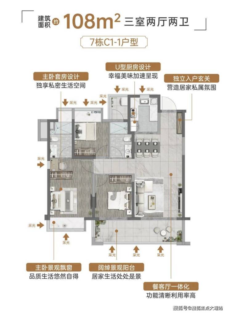 建面约108㎡的端户大三房,其中三卧室、厨房、两卫、入户餐厅、客厅等均设计了采光面,室室采光、全明格局。