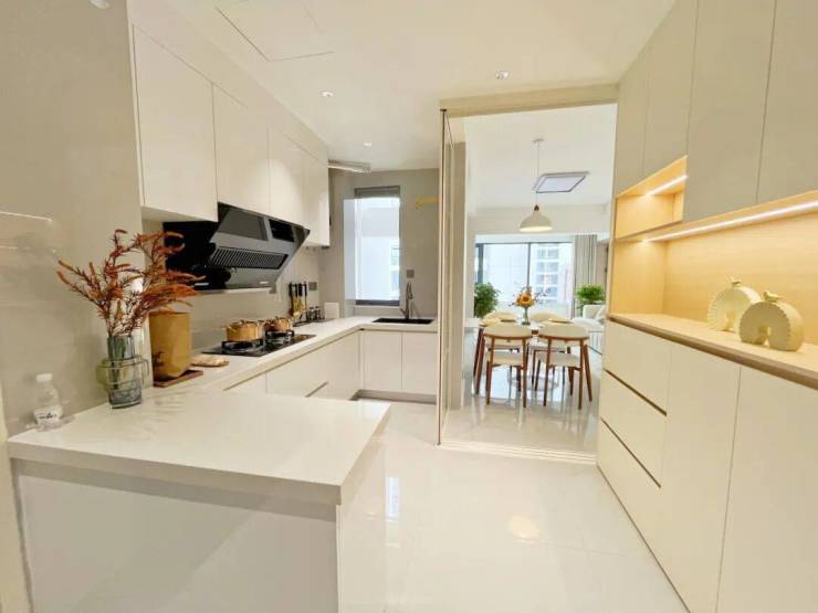 进入房间,餐厨客阳台一体化设计,家长做饭时能照看客厅玩耍的孩子,家人互动零距离,阳光透过西南阳台洒满餐桌,整个空间通透明亮,这才是生活本该有的样子。