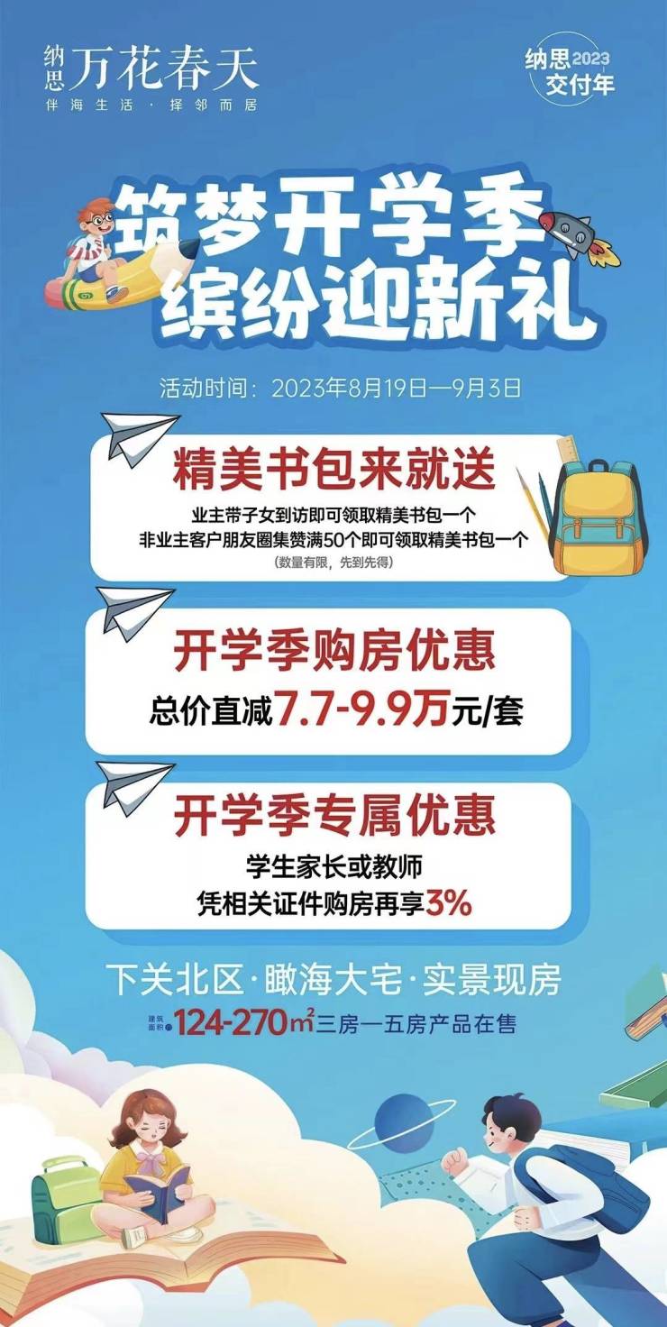 纳思·万花春天,下关北区·瞰海大宅·实景现房,建面约124-270㎡三房至五房产品在售!筑梦开学季,缤纷迎新礼!精美书包来就送;开学季购房优惠,总价直减7.7-9.9万元/套;开学季专属优惠,学生家长或教师凭相关证件购房再享3%!