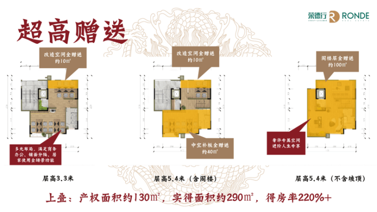 超高赠送率,平均赠送率达222.94%,赠送面积超购买面积,得房率远超传统商业、别墅、第4代住宅,吊打全市场4代住宅!