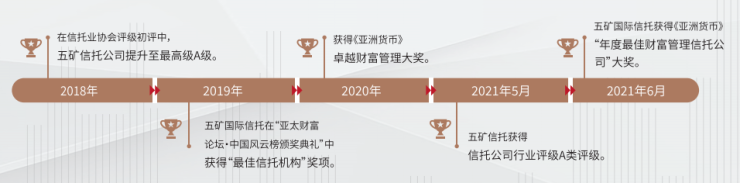 五矿信托2018年在信托业协会评级中提升至最高级A级; 2019年在亚太财富论坛·中国风云榜颁奖典礼中获得“最佳信托机构”奖项; 2020年获得《亚洲货币》卓越财富管理大奖; 2021年获得《亚洲货币》“年度最佳财富管理信托公司”大奖。 中国五矿集团是中央直接管理的国有重要骨干企业。 截至2021年底,中国五矿资产总额超1万亿元,拥有8家上市公司,世界500强排名第58位,位居央企前列。