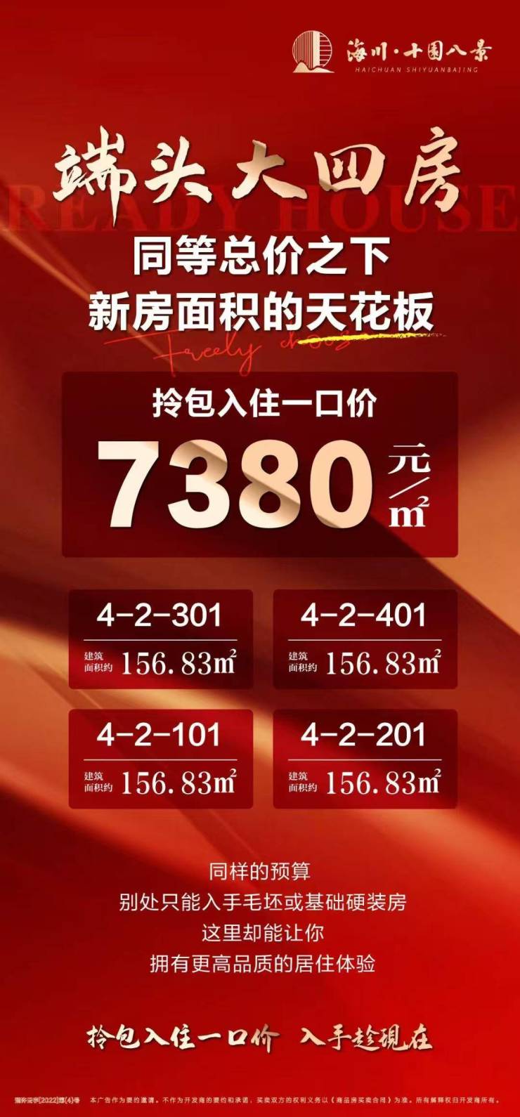 海川·十园八景,端头大四房推荐,拎包入住一口价,入手趁现在!关注海川·十园八景的朋友可前往售楼处现场看房,咨询房源信息请拨打电话400-156-0036 转 426610!