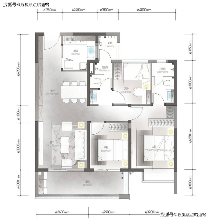 客餐厅一体化,双卫生间设计,动静分区,U型厨房,主卧套房设计