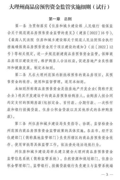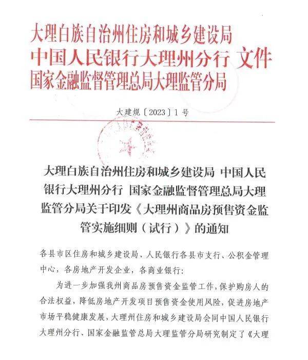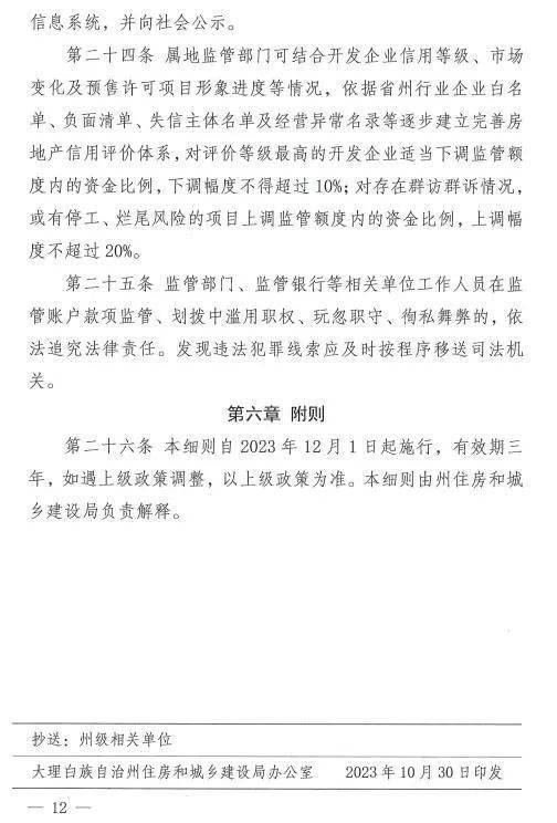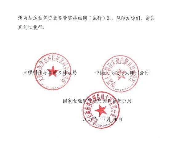 《大理州商品房预售监管资金监管实施细则(试行)》于2023年10月30日印发,12月1日起施行,有效期三年。