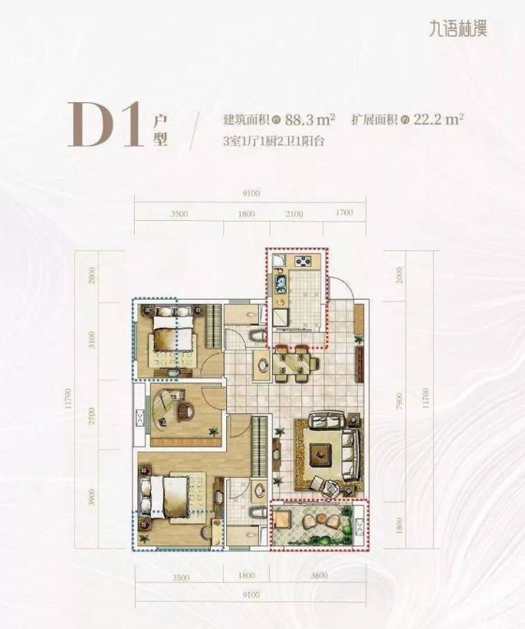 高层D1建筑面积88.3平 扩展面积22.2平 、3室1厅1厨2卫1阳台,总价约87万起(精装修 拎包入住 买房送车位)
