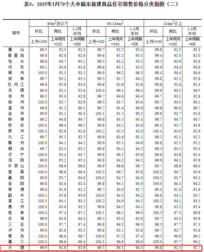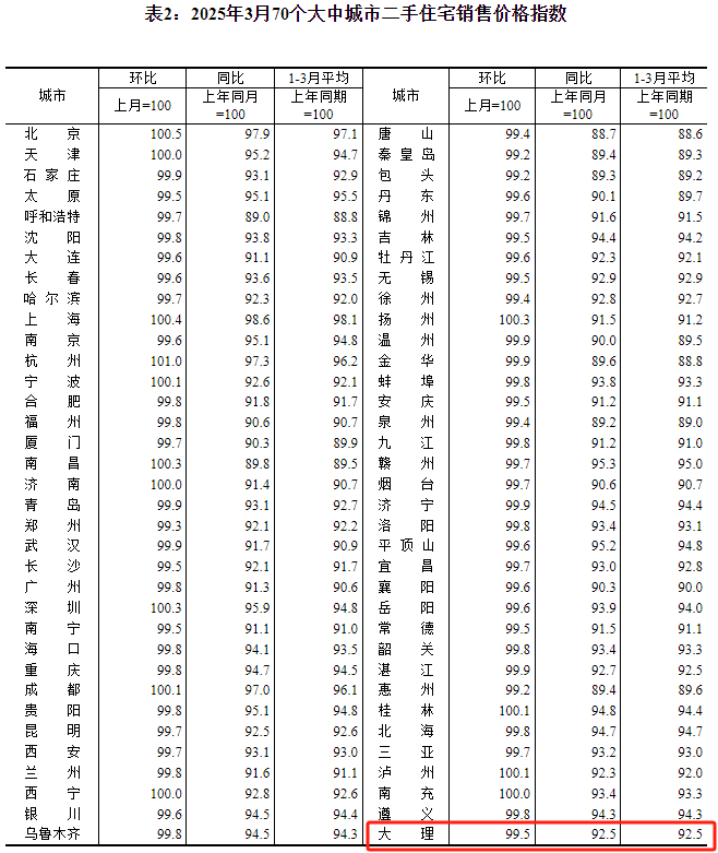 根据发布的数据来看,2025年3月份大理市新建商品住宅销售价格环比下跌0.3%,同比下跌6.8%;2025年3月份大理市二手住宅销售价格环比下跌0.5%,同比下跌7.5%。