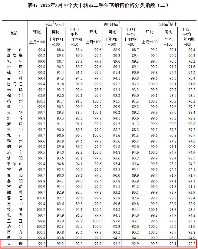 90-144㎡二手住宅销售价格环比下跌0.1%,同比下跌6.8%;