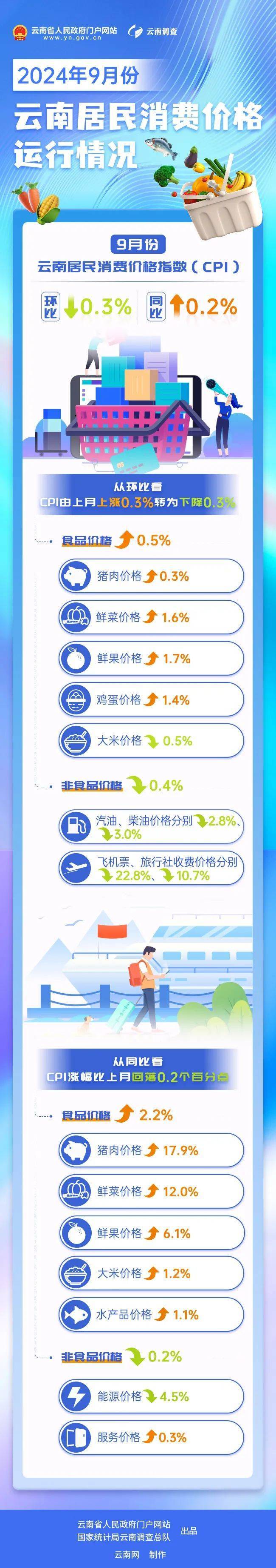 国家统计局云南调查总队根据国家现行统计调查制度开展的居民消费价格调查结果显示:2024年9月份,云南居民消费价格指数(CPI)环比下降0.3%,同比上涨0.2%。