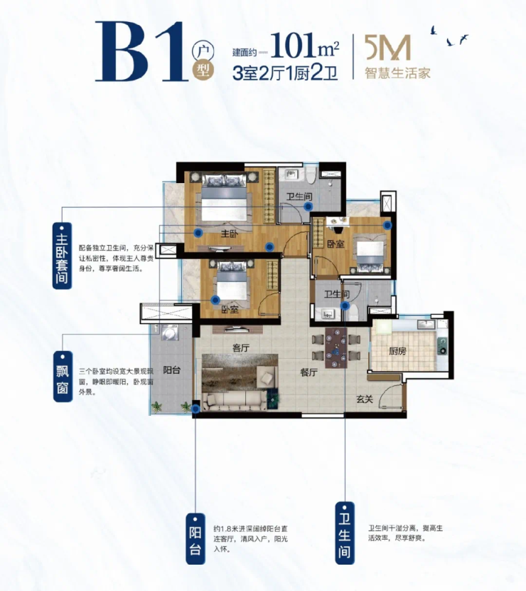 B1户型/建面约101㎡/3室2厅1厨2卫