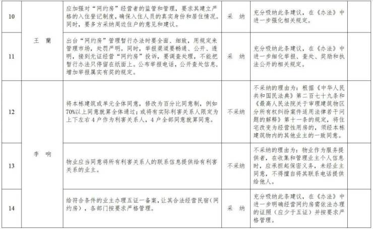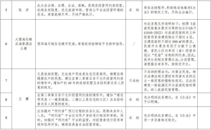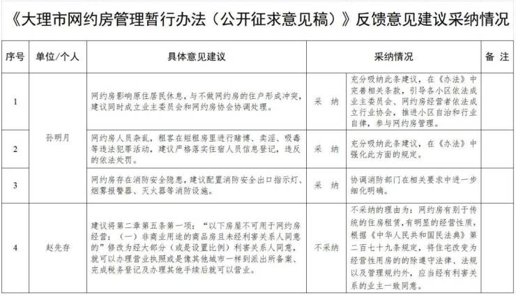 附件:《大理市网约房管理暂行办法(公开征求意见稿)反馈意见建议采纳情况