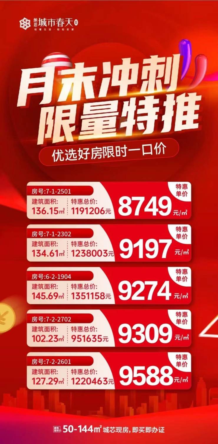 纳思·城市春天,月末冲刺限量特推,优选好房限时一口价!建面约50-144㎡城芯现房,即买即办证!关注纳思·城市春天的朋友可前往售楼处现场看房,咨询房源信息请拨打电话 4001560036 转 268142!
