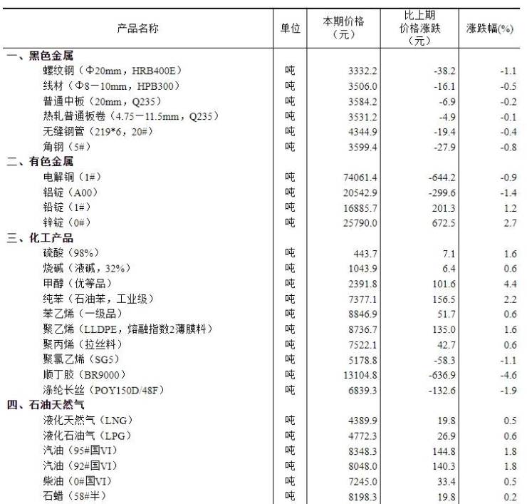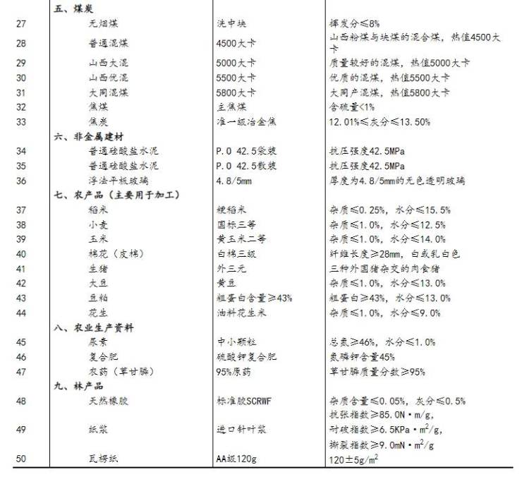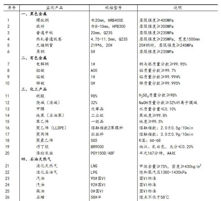 流通领域重要生产资料市场价格监测内容包括9大类50种产品的价格。类别与产品规格说明详见附表。