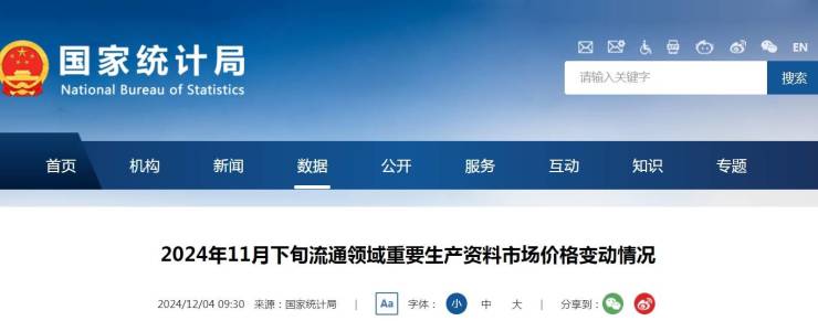 据对全国流通领域9大类50种重要生产资料市场价格的监测显示,2024年11月下旬与11月中旬相比,20种产品价格上涨,30种下降。