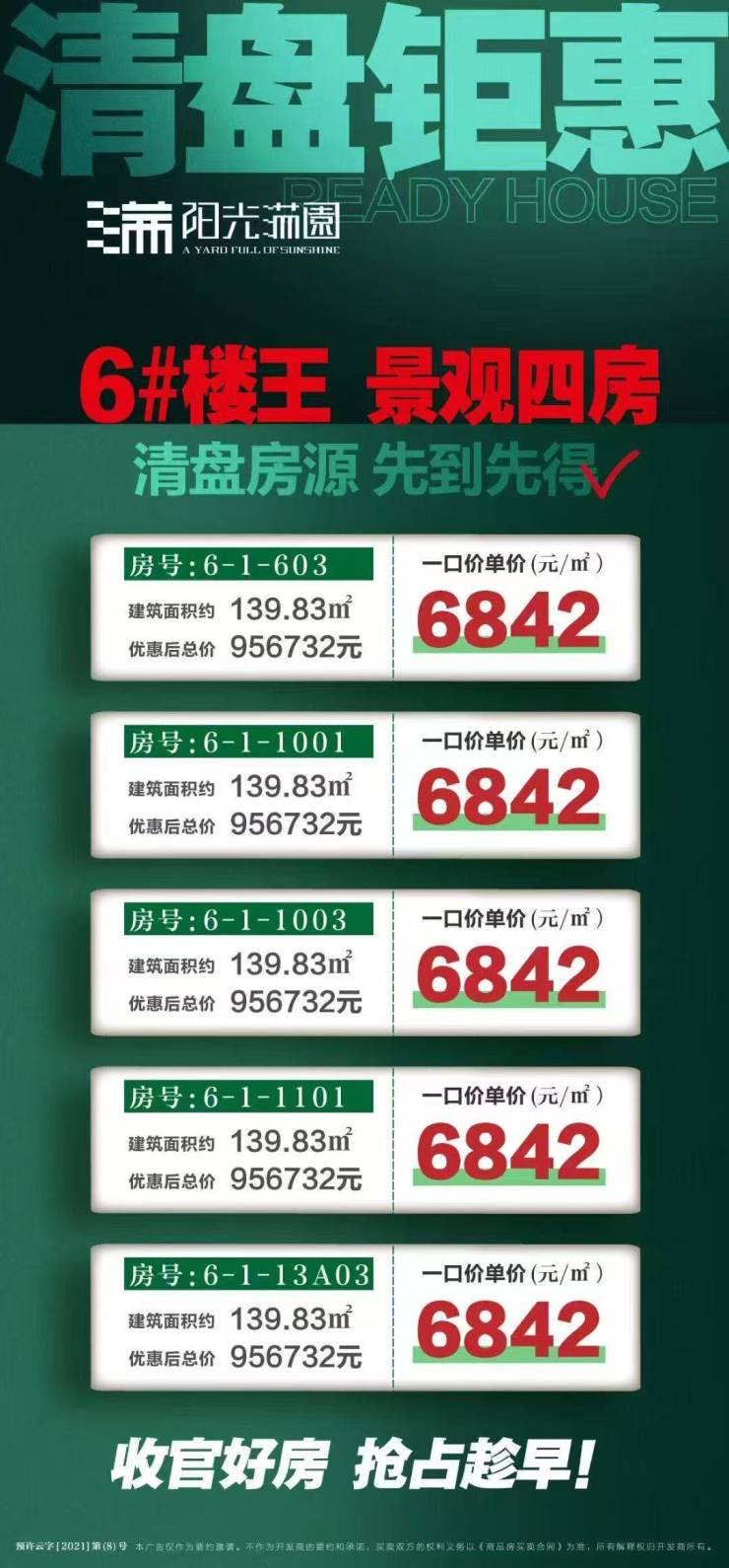 阳光满園 清盘钜惠 6#楼王景观四房 一口价单价约6842元/㎡起