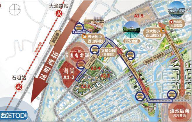 昆明销冠全新观滇『升级』力作 1、项目在售素质最好地块 A1-2规划14栋住宅,1所12班幼儿园;共2634住户,车位配置2834个,配备充电桩车位;规划社区底商及生鲜超市;绿化率40.5%。 市场在售唯一离滇池最近、可观滇且带云附指标项目 栋栋楼王:最大面积地块,最多花园及公区配套,景观视野最大化 背山面滇:北向无高层住宅,视野开阔,采光通风最好 出行最方便:距离石咀地铁站步行7分钟,距离云大附中,步行距离3分钟,不用动车,目送孩子上学 不临高架:噪音、灰尘影响弱,安静舒适 不临工地:周边无在建工地,无工地噪音及灰尘,环境宜居 毗邻TOD:约900M黄金距离,近享高铁TOD商圈繁华 配备独立幼儿园:地块西南角配套1所12班幼儿园