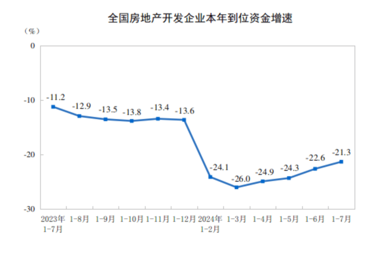 1—7月份,房地产开发企业到位资金61901亿元,同比下降21.3%。其中,国内贷款9216亿元,下降6.3%;利用外资17亿元,下降45.0%;自筹资金22057亿元,下降8.7%;定金及预收款18693亿元,下降31.7%;个人按揭贷款8748亿元,下降37.3%。