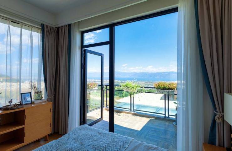 大面积落地玻璃门窗彻底打开了房子的视野,床对面便是美景,视线直抵远方,无限延续了人的内心世界;