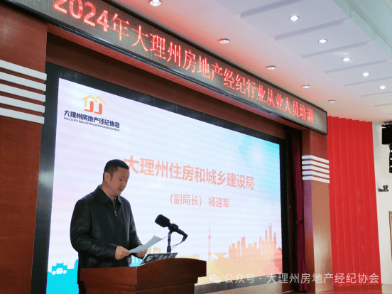 大理州住建局党组成员、副局长杨迎军出席开班仪式并讲话。他首先代表州住建局对培训班的开班表示热烈的祝贺。并从正视存在问题,坚定房地产发展的信心;加强自身建设,构建行业发展的软实力;强化责任担当,发挥行业协会统领作用等3个方面进行发言。他说:“伴随房地产市场的快速发展,房地产经纪行业也日渐兴旺。但在全州房地产中介行业发展上,无论是行业门槛、人员素质、机构诚信度、市场规范程度,都差强人意。进一步规范房地产经纪服务行为,加强房地产经纪机构及从业人员监督管理,营造公平公正的营商环境,是从事房地产经纪工作的根本遵循。同时行业协会要发挥好行业统领作用,守初心、守底线,担当作为,锐意进取,开创新局。用严的规矩、优的作风去引领房经行业健康发展。此次培训,经纪协会做了充分筹备,邀请到北京、昆明等地的行业资深专家前来授课,希望大家珍惜机会,好好学习,通过培训,提高执业水平,强化行业自律,学有所获,学以致用,促进大理州的房地产经纪市场健康发展。”
