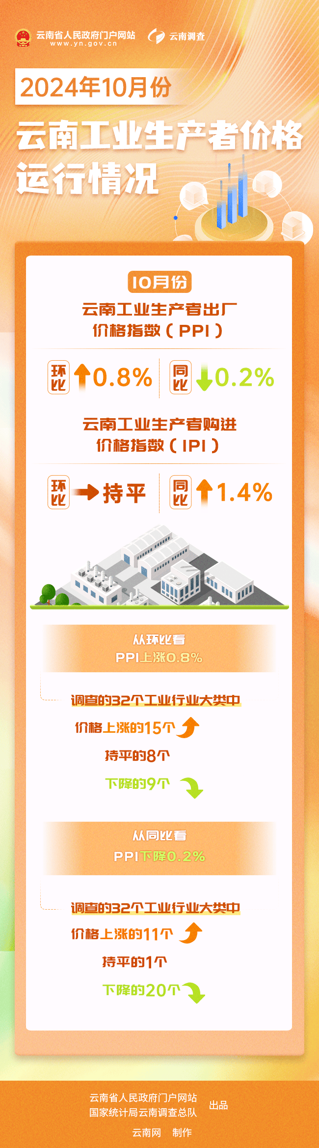 国家统计局云南调查总队根据国家现行统计调查制度开展的工业生产者价格调查结果显示:2024年10月份,云南工业生产者出厂价格指数(PPI)环比上涨0.8%,同比下降0.2%;购进价格指数(IPI)环比持平,同比上涨1.4%。