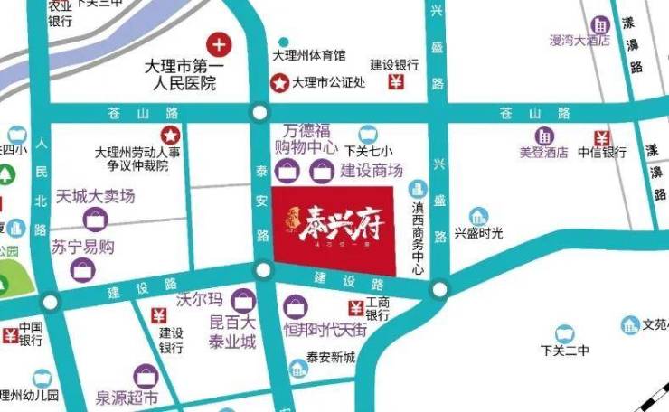 大理市自2011年启动城市改建提升工作,现有原客运中心、交通饭店、小花园、金星村里后山村、西大街文明街、省水利水电工程有限公司大理分公司、水果批发市场、州医院、洱河南路林业局车队、泰兴农贸市场、新桥农贸市场、泰业国际广场南、州外贸大楼、海熙翰林府、鸿元茫涌钢材市场、小关邑(两馆一中心)片区等16个城区改建项目。泰兴府项目是自2011年以来,下关最核心地段的州级重点旧改项目。项目坐落于大理市下关建设东路与泰安路黄金十字交叉口,地理位置优越。项目周边商业配套完善,紧邻泰业昆百大、时代天街等商业中心,大理市下关镇第二幼儿园、下关一小等学校环绕。