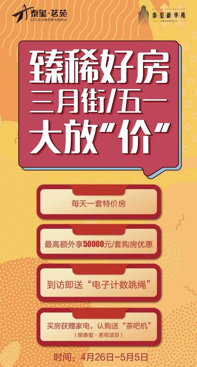 每天一套特价房;较高额外享50000元/套购房优惠;到访即送“电子计数跳绳”;买房获赠家电,认购送“茶吧机”,活动时间4月26日-5月5日!