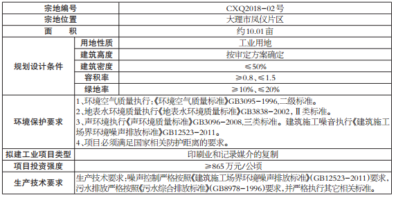 大理市国土资源局、大理白族自治州国土资源局创新工业园区分局计划于近期挂牌出让大理市凤仪片区CXQ2018-02号1宗工业用地,现将该宗地用地信息公示如下: