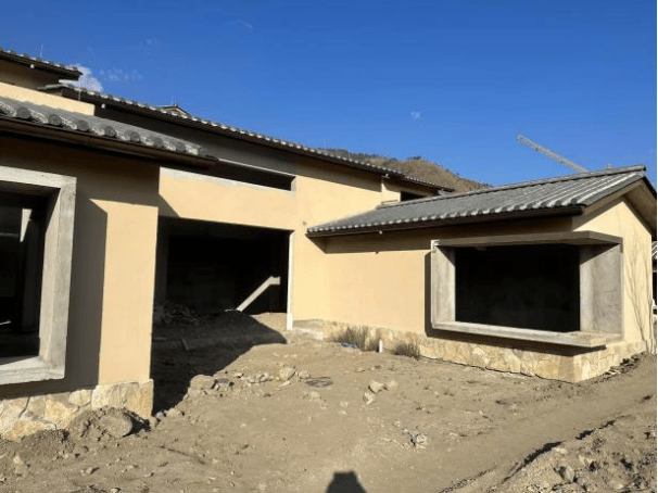 1.结构主体:南地块结构主体已封顶,砌体抹灰已完成,屋面瓦已完成,分户院墙基础完成,挡墙抹灰完成;