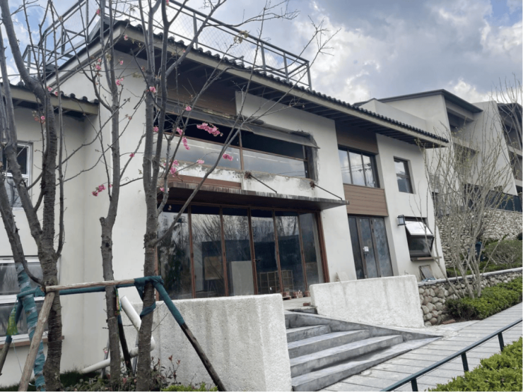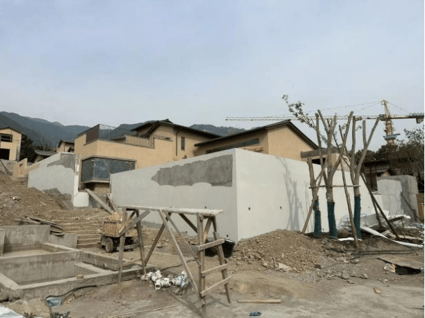 5.隐庐酒店墙体砌筑已按图纸施工完成(外墙及结构开洞改造、钢结构待方案确定),精装单位已进场。外墙涂料外架搭设完成70%。