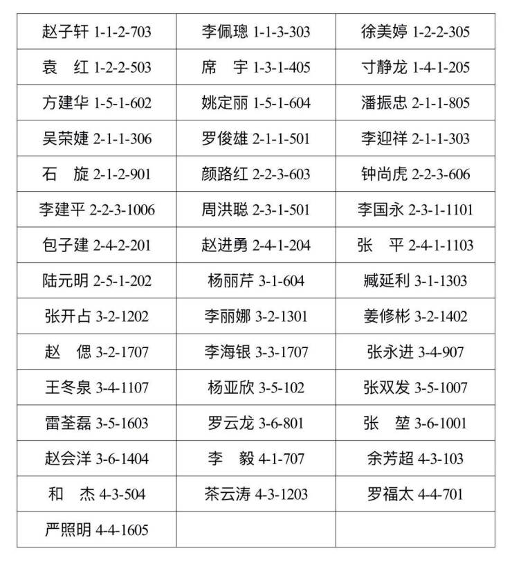 根据《公共租赁住房管理办法》(中华人民共和国住房和城乡建设部令第11号)、《大理经济技术开发区公共租赁住房分配管理实施办法》(大经开发[2020]40号)文件相关规定,经开区保障性住房小区54户承租人存在“拖欠租金累计6个月以上及出现不符合承租公共租赁住房的其他情形”的违规行为。请以下54户承租人,自公告之日起10个工作日内到大理经开保障性住房建设管理有限公司办理退房手续,并结清相关费用。对逾期未办理退房手续的承租人,大理经济技术开发区住房和城乡建设局将按相关规定依法处理。具体承租人名单如下: