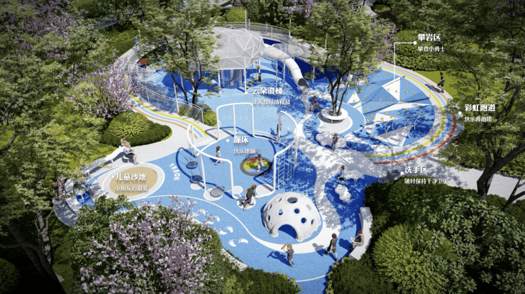 儿童活动区,采用分龄设计,以云端漫步为主题,结合0-3岁,3-6岁、6-9岁儿童的活动特点,设置了三大主题活动区