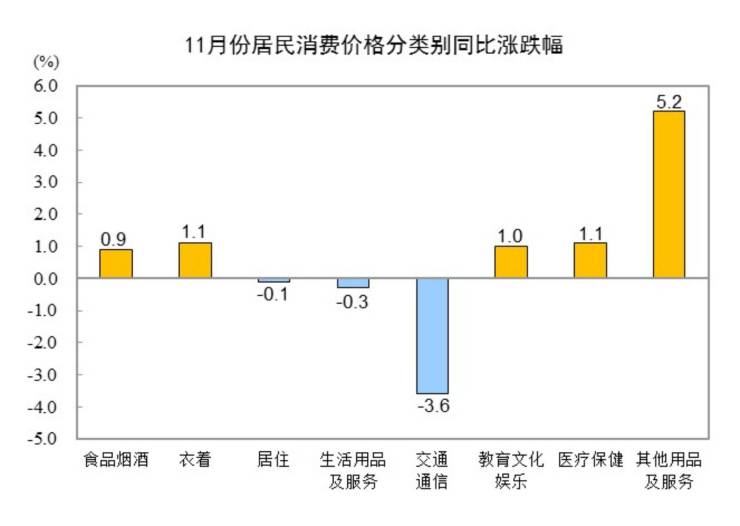 11月份,食品烟酒类价格同比上涨0.9%,影响CPI(居民消费价格指数)上涨约0.26个百分点。食品中,鲜菜价格上涨10.0%,影响CPI上涨约0.20个百分点;畜肉类价格上涨2.4%,影响CPI上涨约0.07个百分点,其中猪肉价格上涨13.7%,影响CPI上涨约0.17个百分点;水产品价格上涨1.8%,影响CPI上涨约0.03个百分点;粮食价格下降1.1%,影响CPI下降约0.02个百分点;鲜果价格下降0.3%,影响CPI下降约0.01个百分点。