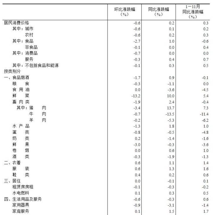 11月份,全国居民消费价格环比下降0.6%。其中,城市下降0.6%,农村下降0.6%;食品价格下降2.7%,非食品价格下降0.1%;消费品价格下降0.7%,服务价格下降0.3%。