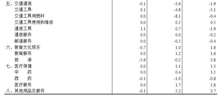 其他七大类价格环比一涨两平四降。其中,衣着价格上涨0.6%;居住、医疗保健价格均持平;教育文化娱乐、生活用品及服务价格分别下降0.7%和0.6%,交通通信、其他用品及服务价格均下降0.1%。