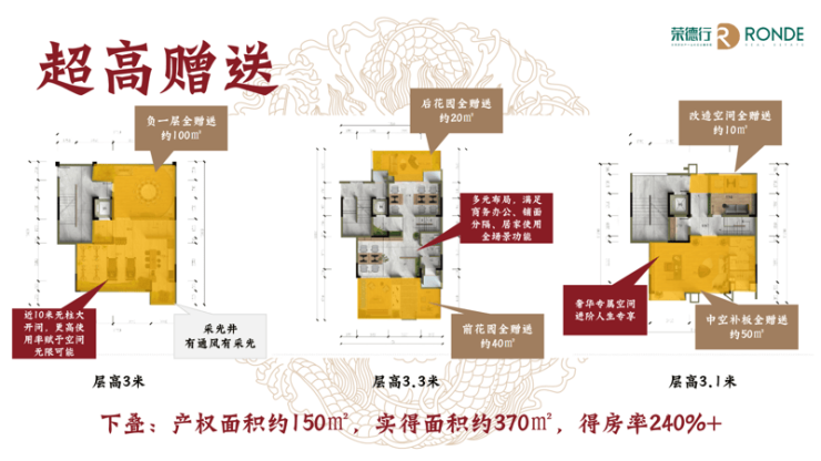 超高赠送率,平均赠送率达222.94%,赠送面积超购买面积,得房率远超传统商业、别墅、第4代住宅,吊打全市场4代住宅!