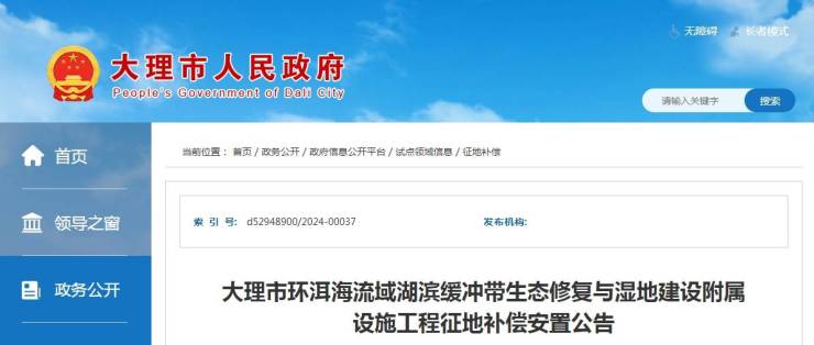 大理市环洱海流域湖滨缓冲带生态修复与湿地建设附属设施工程征地补偿安置公告