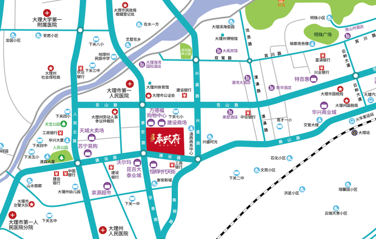 天城·泰兴府,近享时代天街、泰业国际广场、滇西商务中心等周边醇熟商业配套,把繁华自在安放家门口;大理市下关镇第二幼儿园、下关一小、下关一中、下关二中、大理州民族中学,学府在旁,韵传翰墨书香;洱海、苍山、人民公园等风景区环伺周边,更有大理州医院、大理市医院、大理市中医院等医疗资源环聚,城市繁华配套一应俱全。
