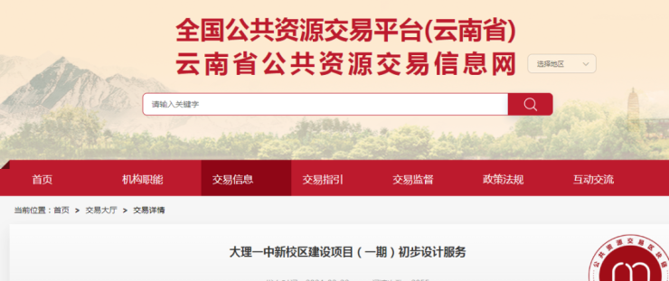 近日,云南省公共资源交易中心发布了“大理一中新校区建设项目(一期)初步设计服务”招标公告,据公告显示此次招标估算价为395.23万元,新校区地址为大理市大理镇阳和村委会五里桥村(洱大道以南)。