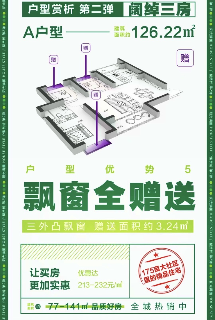 据搜狐焦点大理站获悉,大理阳光满園,A户型建面约126.22㎡阔绰三房,飘窗全赠送,优惠达213-232元/㎡!