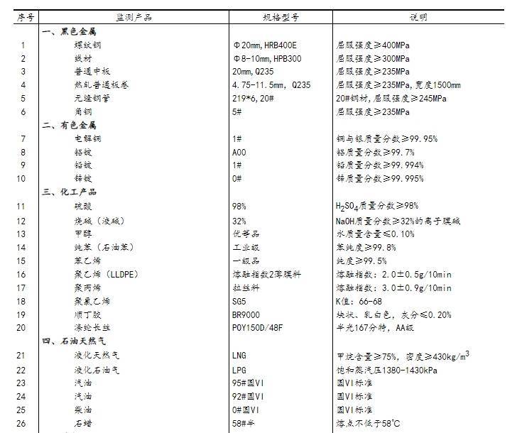 流通领域重要生产资料市场价格监测内容包括9大类50种产品的价格。类别与产品规格说明详见附表。