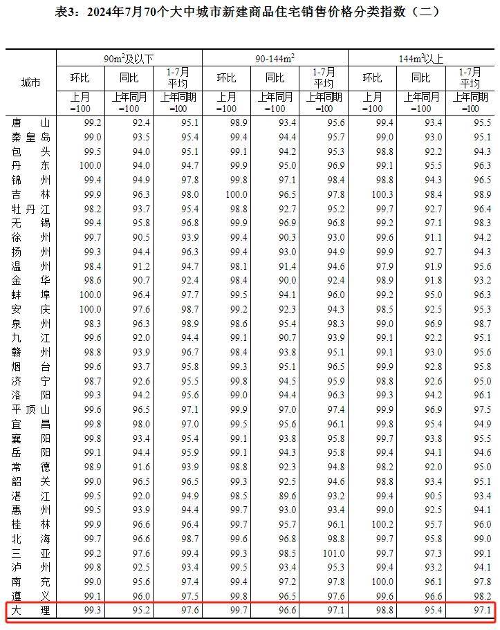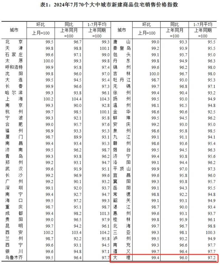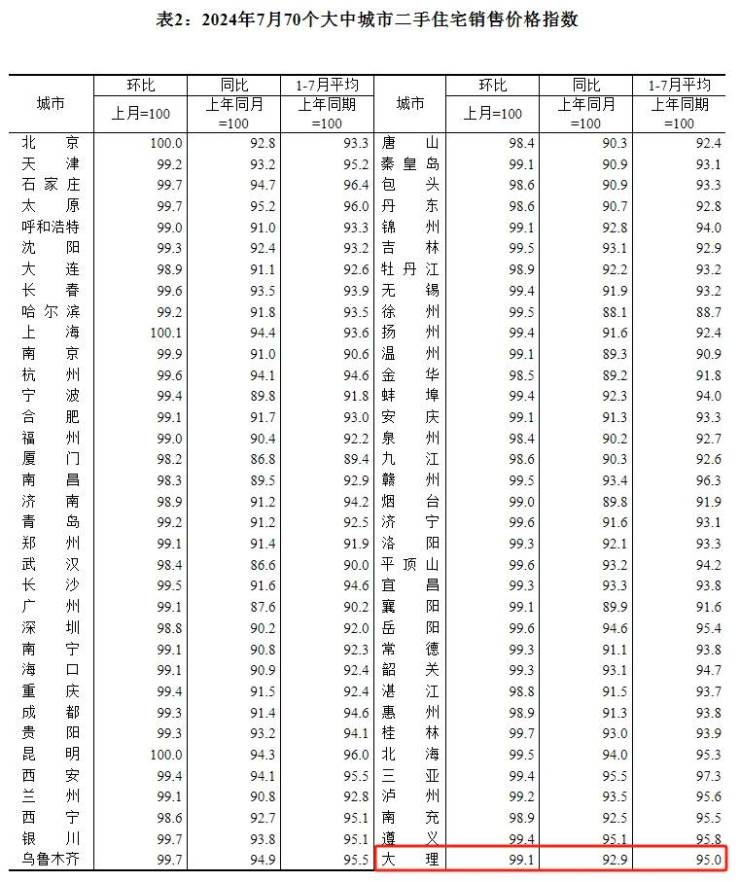 最新!7月大理市新房价格环比下跌0.6% 二手房价格环比下跌0.9%