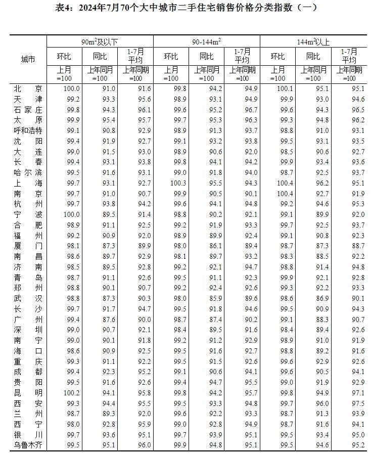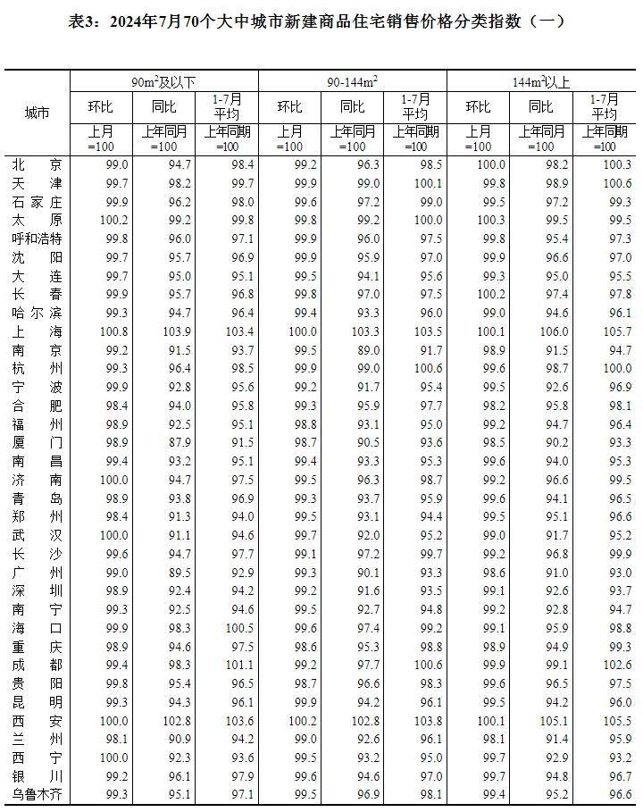 近日,国家统计局发布2024年7月份70个大中城市商品住宅销售价格变动情况!