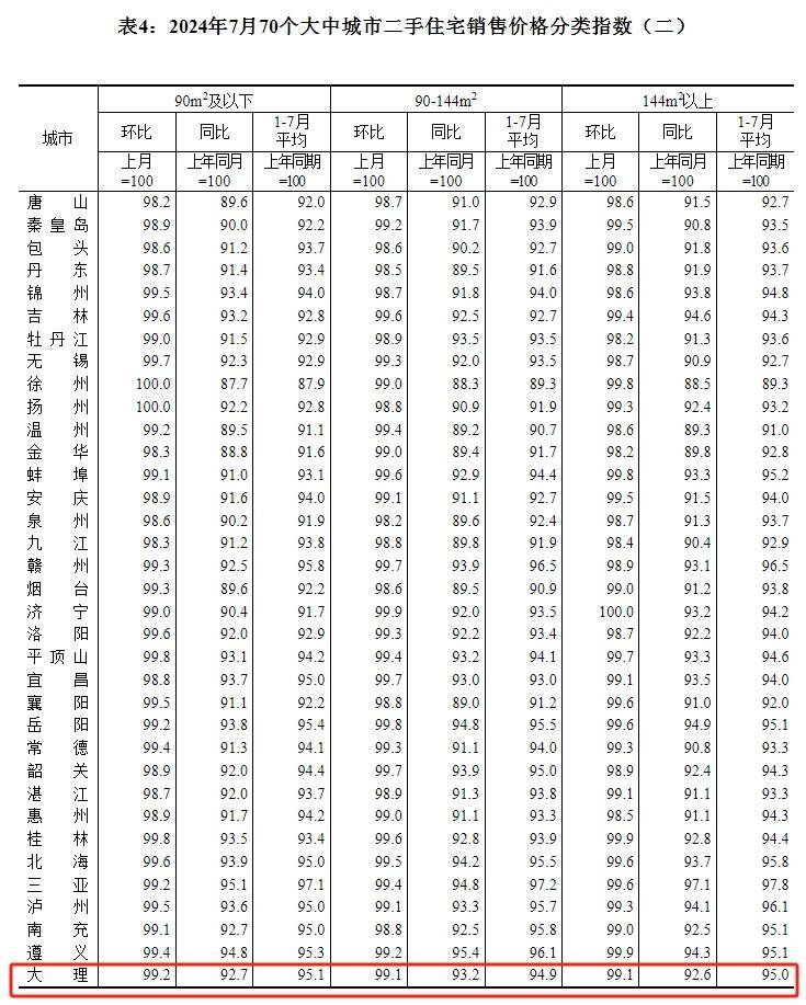 根据发布的数据来看,2024年7月份大理市新建商品住宅销售价格环比下跌0.6%,同比下跌4%;2024年7月份大理市二手住宅销售价格环比下跌0.9%,同比下跌7.1%。