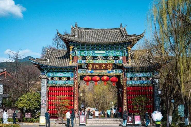 自元至清,此地先后名为“束和”“十和”“束河”。束河之名,一是体现了复古名之意愿。二是束河古镇的道路分布俨然就是一个“束”字;镇内有青龙河、疏河与九鼎河并流过境,合为“束河”。纳西语中称此地为“绍坞”或“刷坞”,“绍(刷)”者峰高也,“坞”者村寨也,合起来意为“高峰下的村寨”。