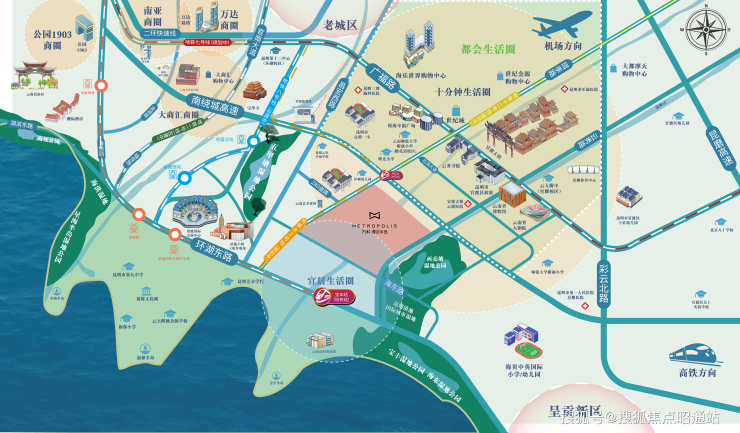 9大文体荟萃:汇集官渡古镇、省博物馆、省大剧院、文学艺术馆、昆明规划馆、宝华寺、滇池会展中心、新亚洲体育城,串联起城市人文中轴线;