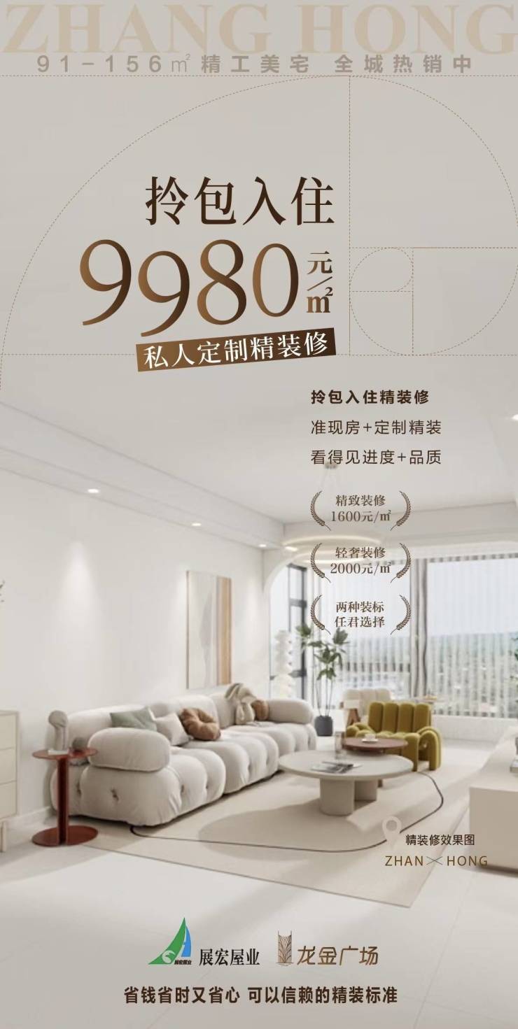 展宏·龙金广场,建面约91-156㎡精工美宅,全城热销中,9980元/㎡起拎包入住!关注展宏·龙金广场的朋友可前往售楼处现场看房,咨询房源信息请拨打电话4001560036 转 451395!