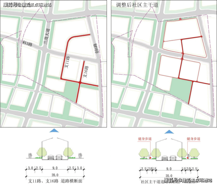 为响应“资源节约型、环境友好型”建设的实践,达到集约开发,构建开放式的社区,本次调整将支11路、支16路调整为社区内部道路,调整后路网更加合理顺畅。