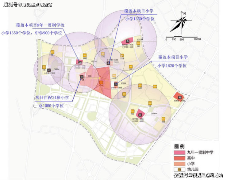 用地范围周边小学分布:项目周边上位规划中已有配建小学可以完全覆盖到本项目,在本次总体规划中,用地内自配一所24班小学,不足部分学位由上位规划统一筹建,按规定缴纳代建金。