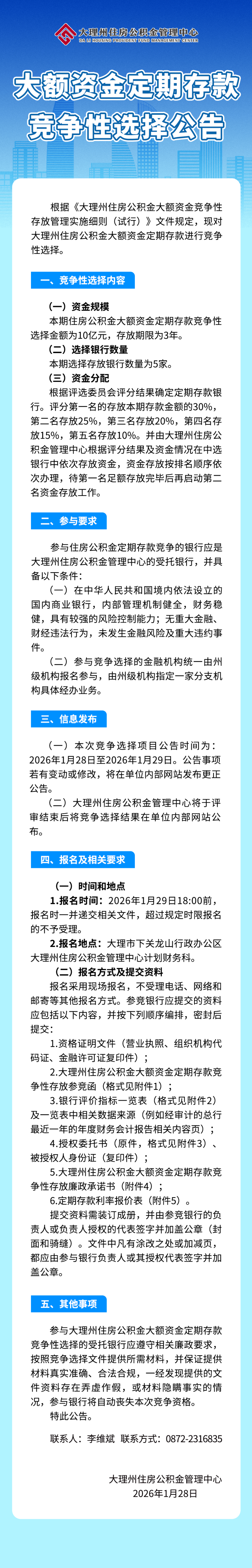 根据《大理州住房公积金大额资金竞争性存放管理实施细则(试行)》文件规定,现对大理州住房公积金大额资金定期存款进行竞争性选择。