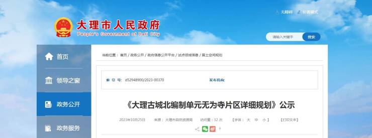 昨日(10月25日),大理市人民政府发布《大理古城北编制单元无为寺片区详细规划》公示。