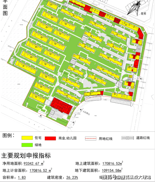 今年6月,昆明市自然资源和规划局发布了“昆明市丽阳星城二期A4地块建设工程规划许可证批前公示”。公示里显示,丽阳星城二期项目由原来的高层住宅改规为6-12层的洋房产品。从昆明空间规划发布平台获取的平面图看,该项目净用地面积93342.67㎡,总建筑面积约279971.1㎡(含地上地下)。惊喜的是,容积率仅为1.83,建筑密度为26.23%,绿地率40%,从整体数据来看,该地块将要打造的是低密度的住宅区,整体的居住舒适度不会差。